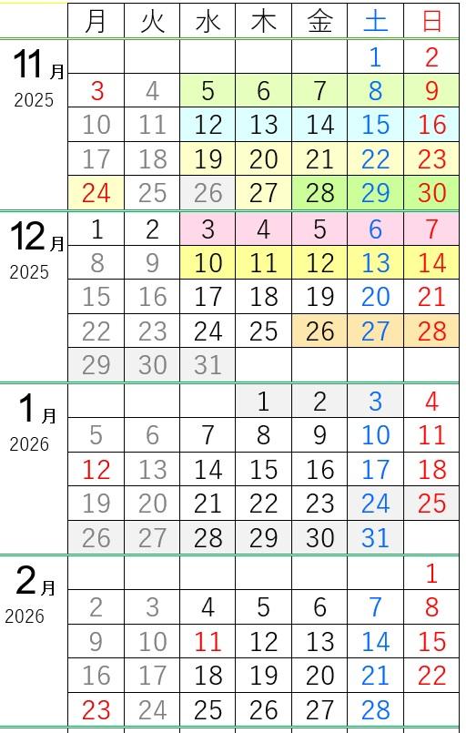 11/24は月曜日ですが臨時営業します。11/26は水曜ですが臨時休業をします。 |